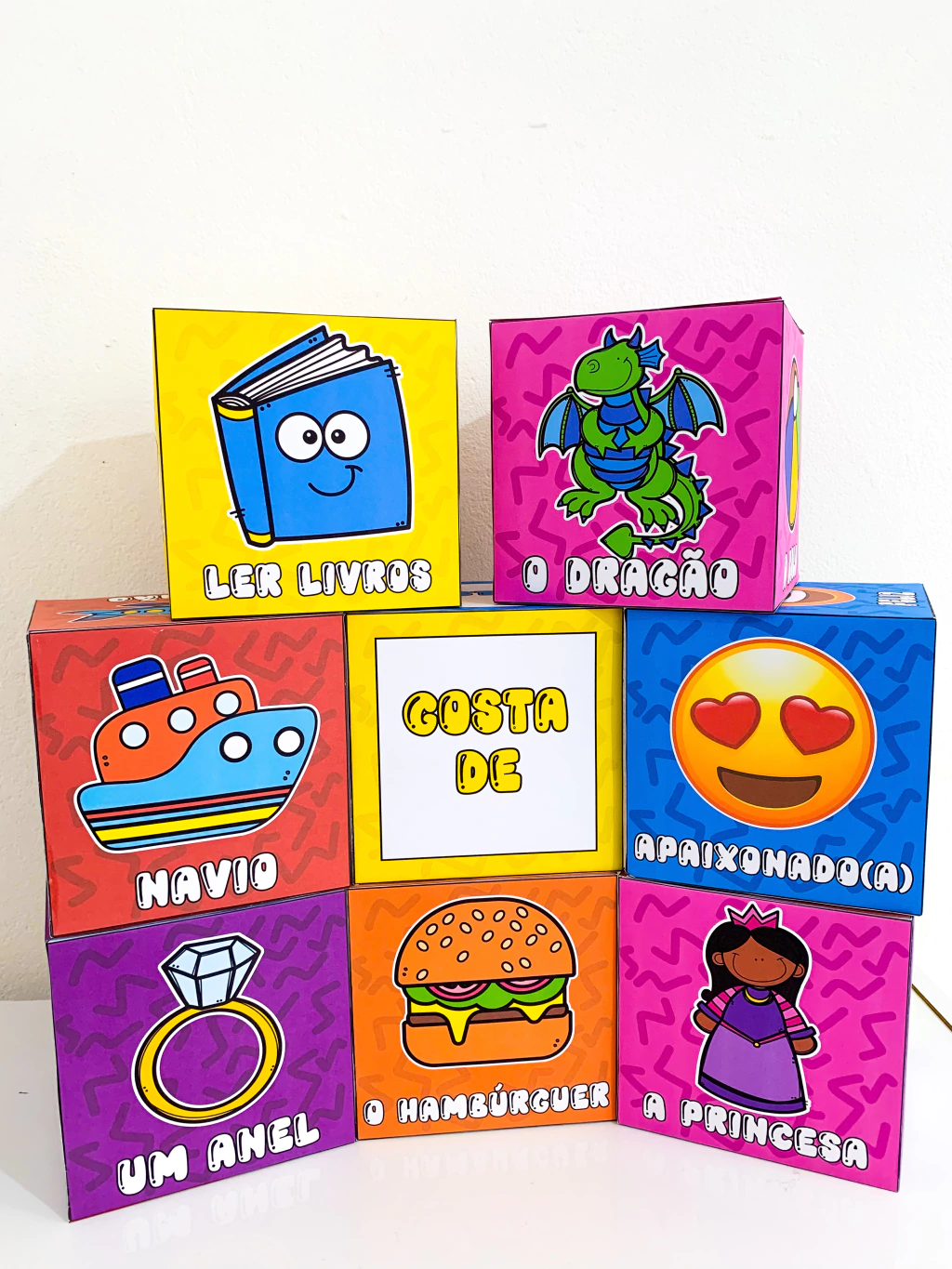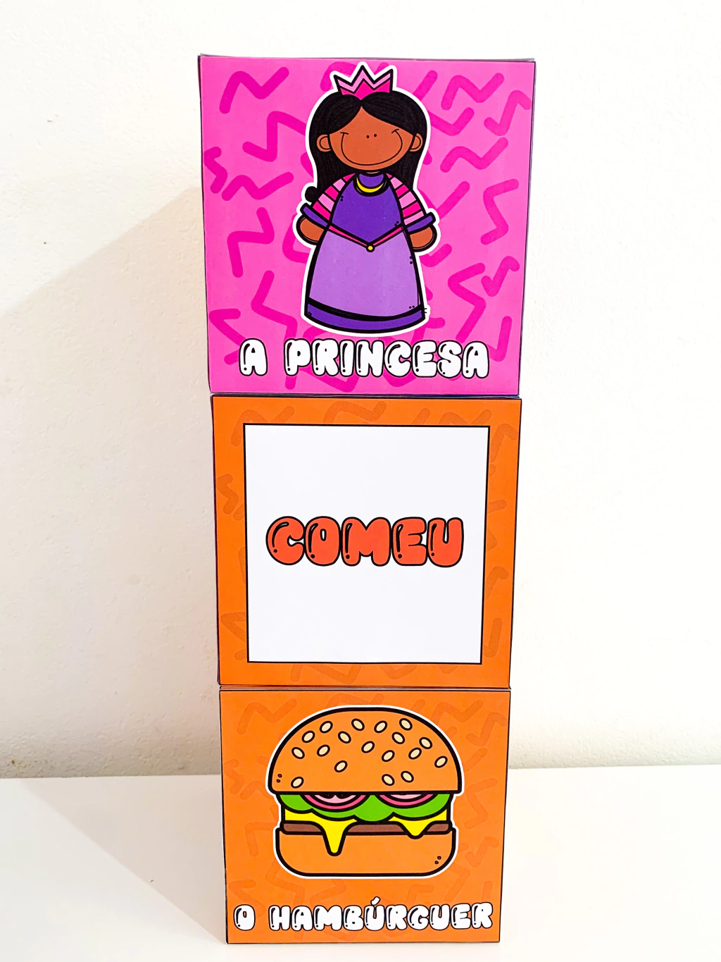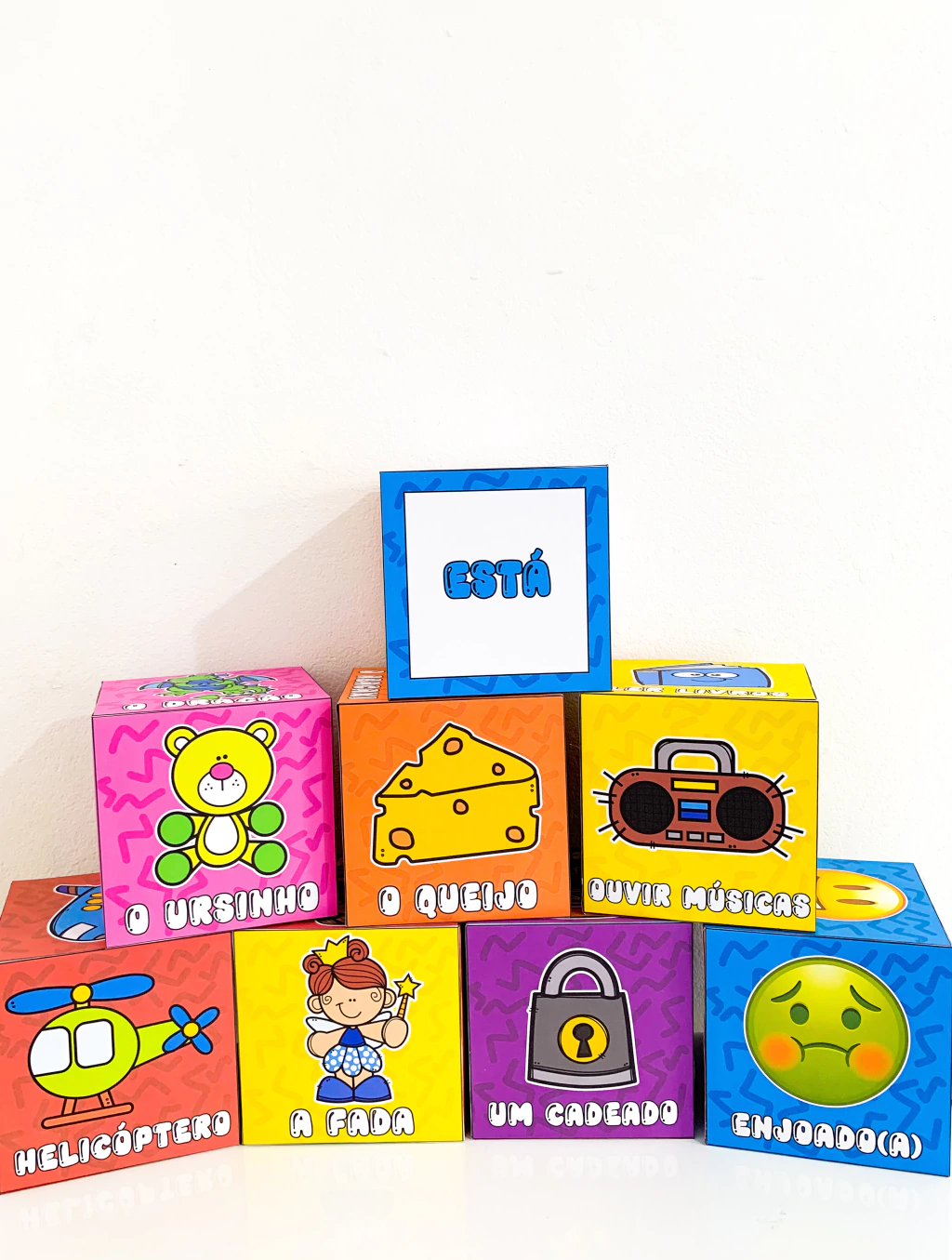 Recurso com conjunto de oito dados para trabalhar formação de frases com crianças em fase de alfabetização, sendo: