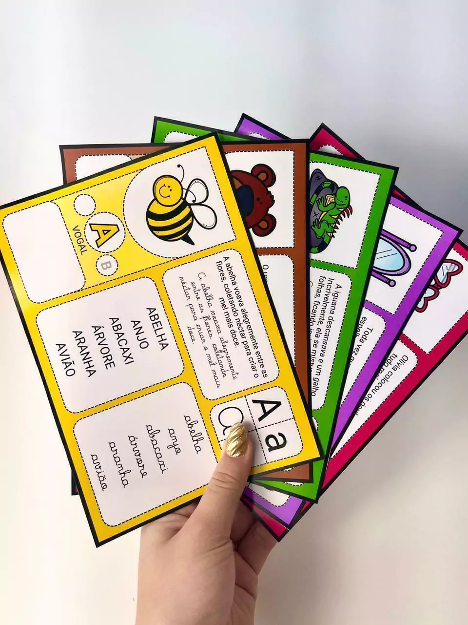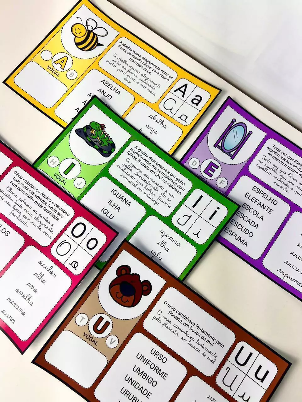 Essas fichas contém palavras, imagens, sílabas simples, letras nas quatro formas, indicativo de vogal ou consoante e imagem.