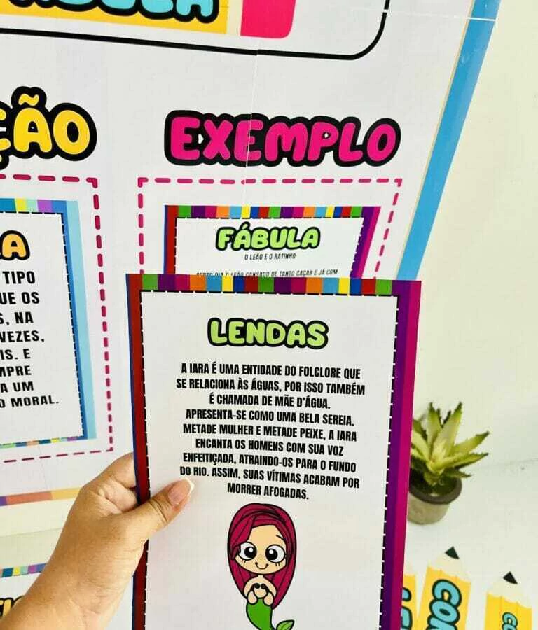 Cada cartão traz detalhes sobre gêneros como fábulas, crônicas e quadrinhos, auxiliando no desenvolvimento de habilidades de interpretação e expressão.